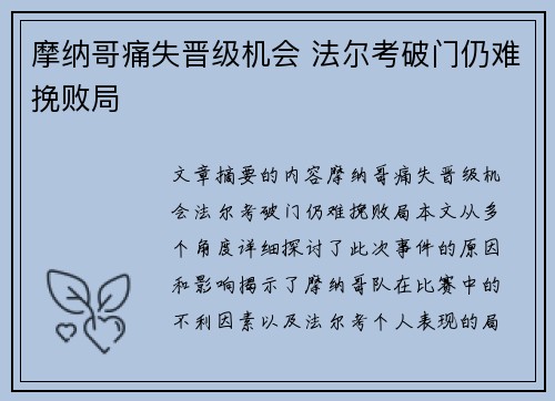 文章摘要的内容:摩纳哥痛失晋级机会,法尔考破门仍难挽败局。本文从多个角度详细探讨了此次事件的原因和影响,揭示了摩纳哥队在比赛中的不利因素以及法尔考个人表现的局限性。通过分析球队战术、对手实力、关键时刻的失误和球员表现等方面,展现了他们未能晋级的内在原因。江苏体...